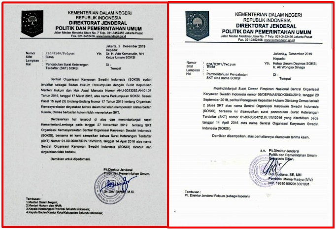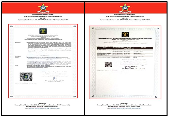 Legal standing atas nama SOKSI (Sentral Organisasi Karyawan Swadiri Indonesia) dari Pemerintah, hanya ada pada kami yaitu Kepmenkumham RI Nomor : AHU – 0000578. AH.01.08 Tanggal 26 April 2023 dengan Ketua Umum Ali Wongso Halomoan Sinaga, Sekjen Dr.Iliyas Indra, Bendum KGPH.Dr.Muhammad K Hasanuddin.
