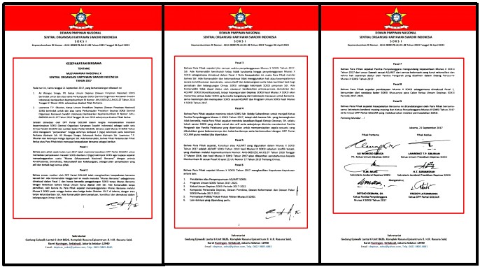 Untuk opsi Munas Bersama ini kami selaku SOKSI juga sudah memberikan kesempatan luas kepada Ketua Umum Dewan Pimpinan Nasional DEPINAS SOKSI Sdr Ahmadi Noor Supit beserta Sekjennya Sdr Misbakhun untuk membuktikan pernyataan dan janjinya dihadapan Ketua Umum Partai Golkar Sdr Bahlil Lahadalia dan dihadapan kami bersama Rapat DPP Partai Golkar yang dipimpin sdr Fadh pada 5 Maret 2025 lalu, bahwa “Sdr Ahmadi Noor Supit berjanji akan sanggup segera memegang SKT Mendagri atas nama Sentral Organisasi Karyawan Swadiri Indonesia disingkat SOKSI” yang akan diterbitkan kembali oleh Kemendagri pasca pernah dicabut oleh Kemendagri pada 3 Desember 2019 lampau.