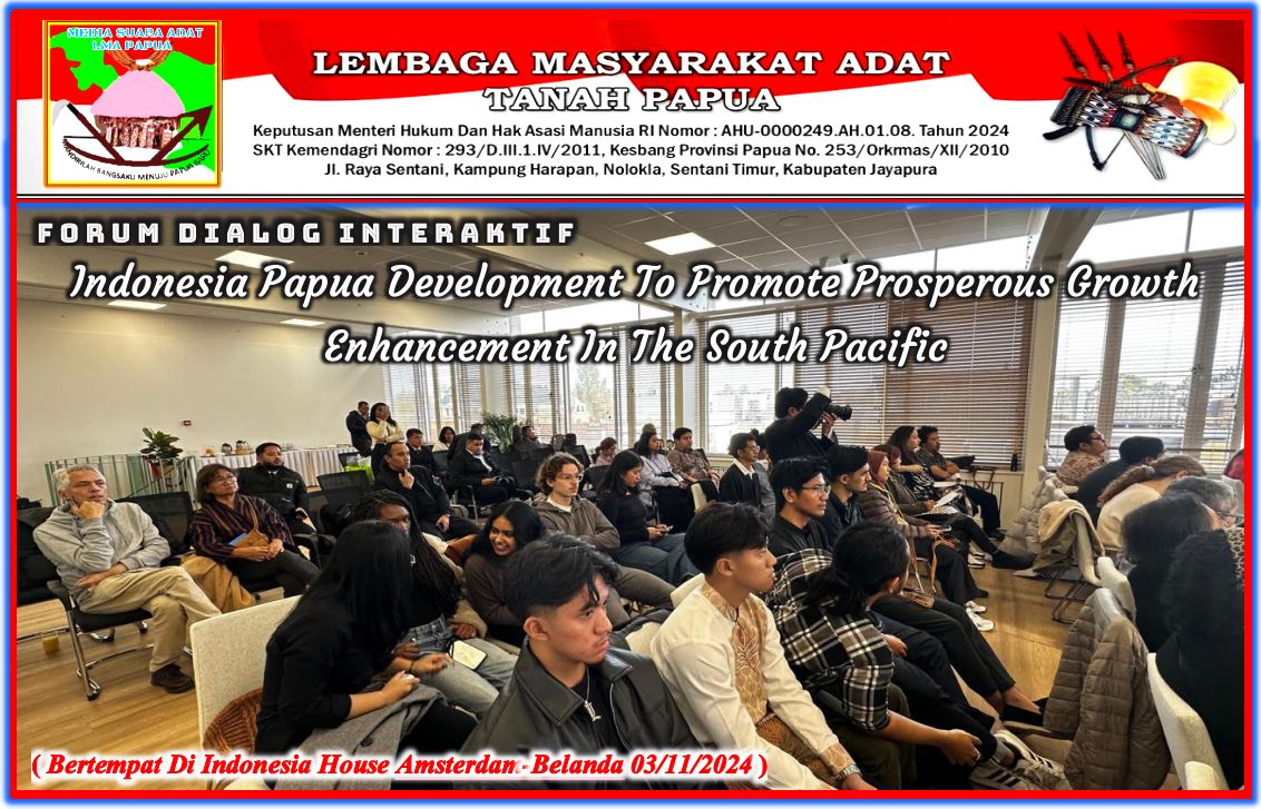 Forum Dialog interaktif ini dihadiri sekitar 100 peserta dari berbagai elemen masyarakat di Belanda dengan latar belakang yang bervariasi, seperti PPI Belanda dan mahasiswa asing, NGO, Lembaga think thank, media lokal dan diaspora Indonesia. Dialog yang bertemakan ” Indonesia Papua Development to promote Prosperous Growth Enhancement in the South Pacific” menghadirkan tiga orang nara sumber yang merupakan putra asli yang lahir dan besar, berprestasi dan berkarya untuk kemajuan tanah Papua Indonesia. Mereka adalah Dr. Yacob Selvinus Fonataba, Msi., Sekda Provinsi Papua Barat, Pascal Norotouw, S.IP., MA, Msc., tokoh pemuda Papua, dan Dr. Lenis Kagoya, S.TH., M.Hum., perwakilan Lembaga Masyarakat Adat Papua (LMA)