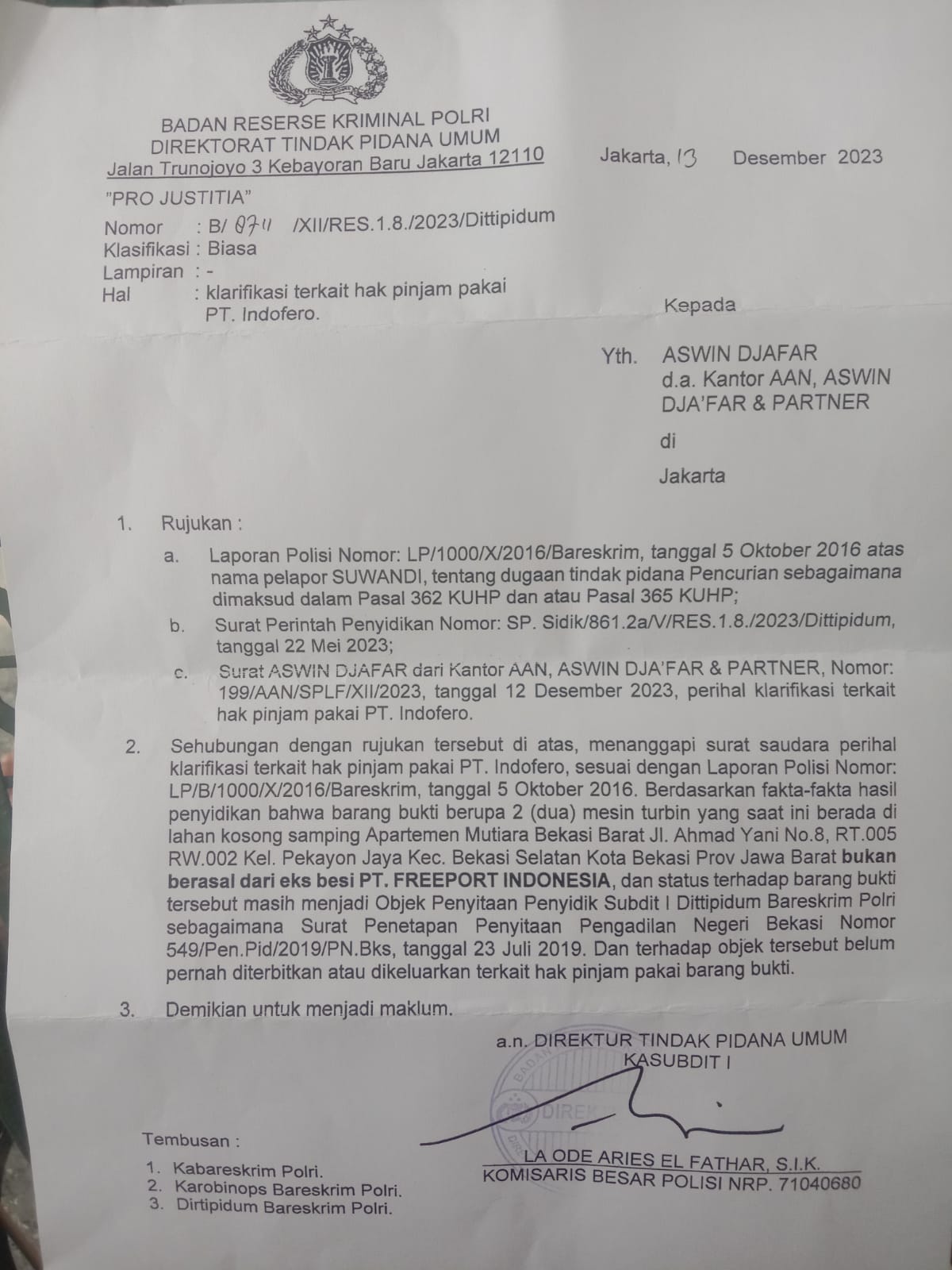 Kutipan Inti Dalam Surat B/8711/XII/RES.1.8./2023/Dittipidum Tertanggal 13 Des 2023 Menjelaskan :