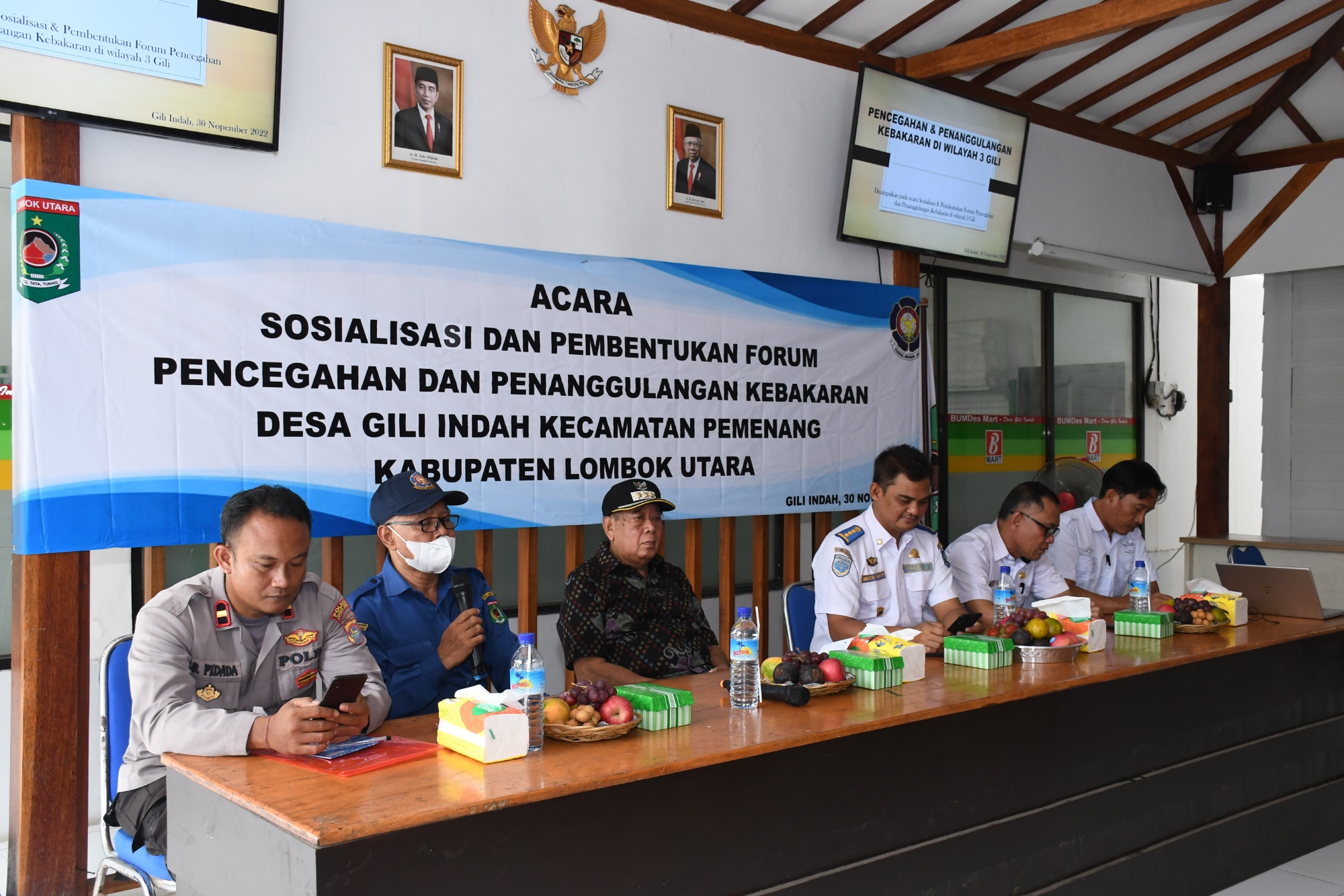 Bupati Lombok Utara H Djohan Sjamsu SH membuka secara resmi kegiatan sosialisasi dan pembentukan forum pencegahan dan penanggulangan kebakaran kawasan pariwisata Gili Tramena Kecamatan Pemenang, Rabu (30/11/2022) di Aula Kantor Desa Gili Indah.