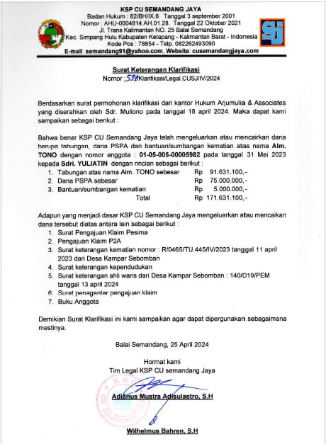 Berdasarkan keterangan tertulis, pihak CU semandang jaya mengatakan, Alasan pencairan dana sebesar lebih kurang Rp. 171 jutaan tersebut sekitar bulan Mei tahun 2023 adalah surat keterangan ahli waris, kemudian dikonfirmasi lagi kepada GM CU Semandang jaya, via WhatsApp, GM mengatakan bahwa ada surat adattyang menyatakan bahwa Sdri Y, mencairkan.