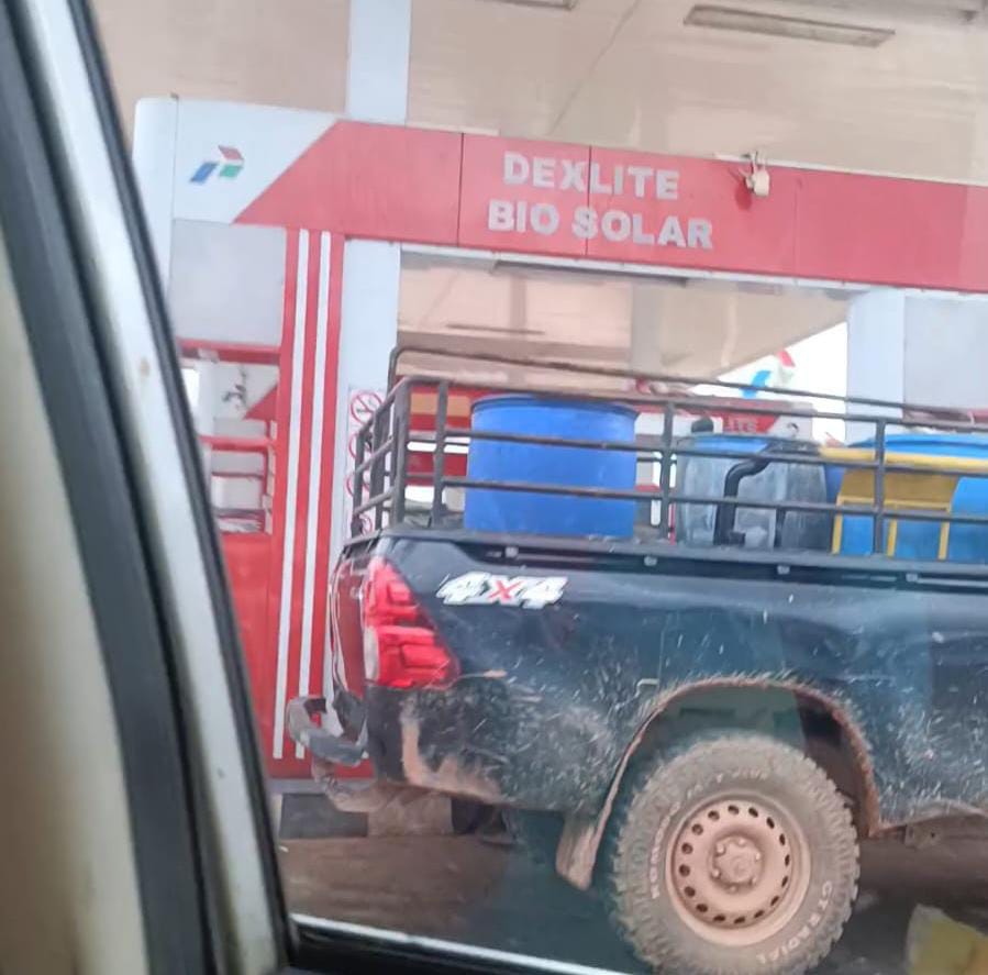 Terlihat aktivitas kendaraan losbak jenis pickup hitam secara bebas mengisi bahan bakar minyak dengan santai dan terang-terangan.