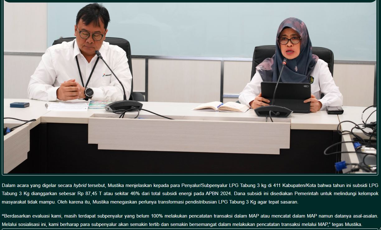 Dikatakannya padahal tahun ini subsidi LPG Tabung 3 Kg dianggarkan sebesar Rp 87,45 T atau sekitar 46% dari total subsidi energi pada APBN 2024. Dana subsidi ini disediakan Pemerintah untuk melindungi kelompok masyarakat tidak mampu. Oleh karena itu pemerintah pusat mengharapkan dukungan semua pihak dalam pelaksanaan transformasi pendistribusian isi ulang LPG tabung 3 kg yang tepat sasaran.