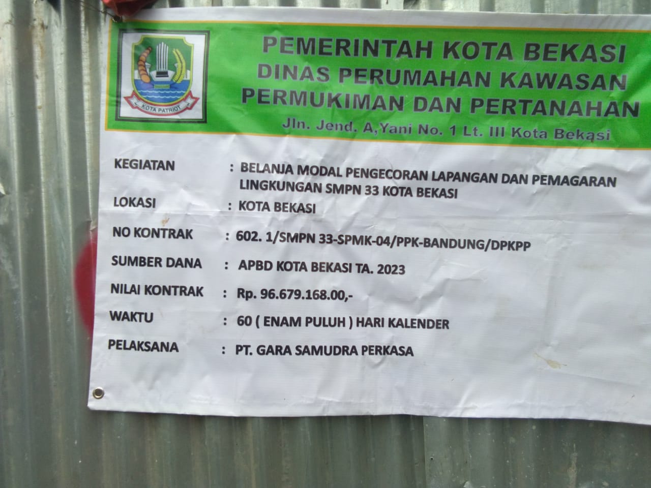 Dan dari Dinas Perumahan, Kawasan Permukiman dan Pertanahan Kota Bekasi sebesar Rp 96.679.168,-.dikerjakan oleh PT. Gara Samudera Perkasa dengan Nomor Kontrak 601.1/SMPN 33/SPMK-04/PPK-Bandung/DPKPP. Sumber Dana APBD Kota Bekasi TA 2023.