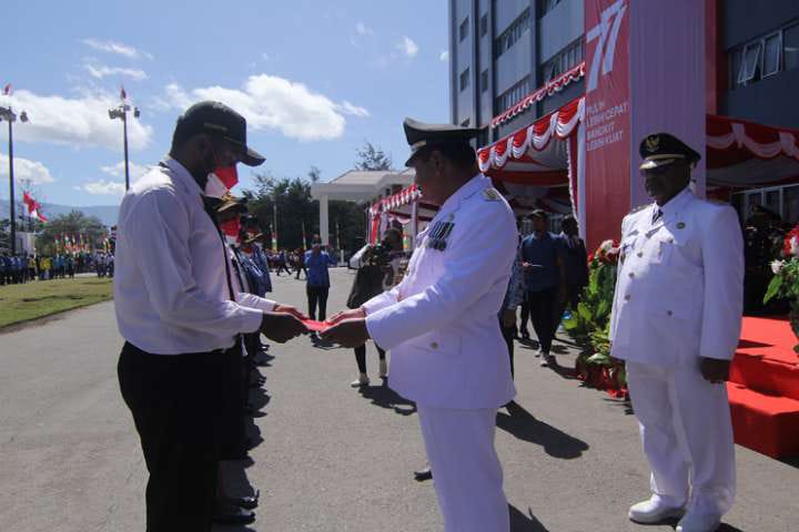 Dalam rangka HUT Ke -77 RI, Pemerintah Kabupaten Jayawijaya juga menyerahkan SK Pegawai Negeri Sipil (PNS) yang sudah ikut prajabatan beberapa bulan yang lalu.