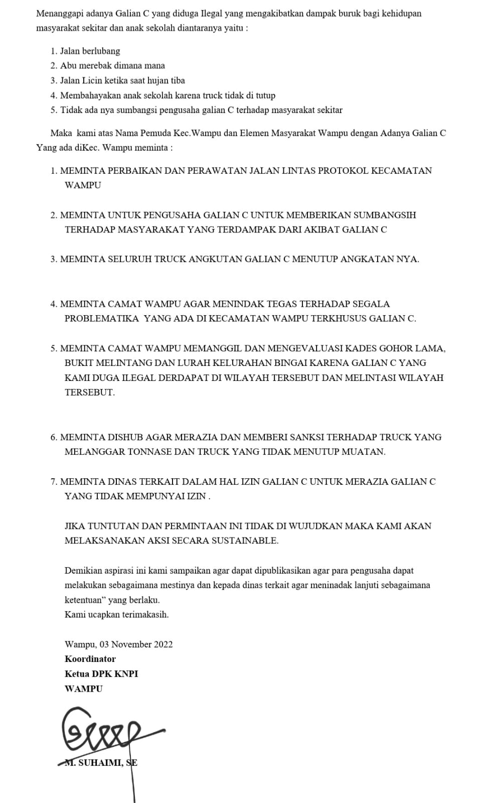 “Inilah permintaan kami sebagai masyarakat wampu dan apabila hal ini tidak ditanggapi, maka kami akan melakukan aksi secara sustainable,” kata Suhaimi dengan nada geram (*)