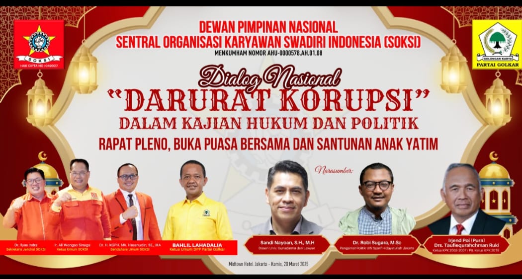 PERISTIWAINDONERSIA – Dewan Pimpinan Nasional (Depinas) Sentral Organisasi Karyawan Swadiri Indonesia (SOKSI) menggelar Dialog Nasional bertema ‘Darurat Korupsi dalam Kajian Hukum dan Politik’ di Town hall Resto, Hotel Midtown, Jakarta. (20/03/2025).