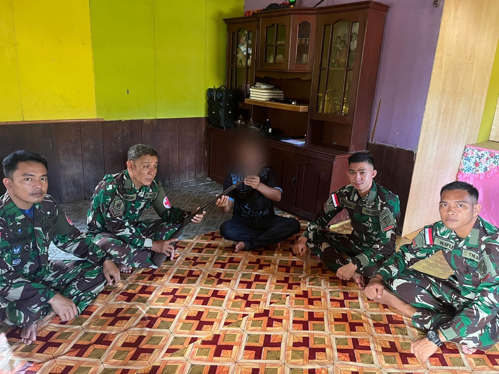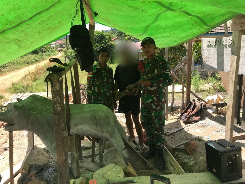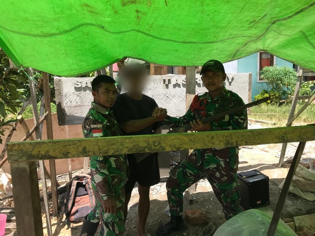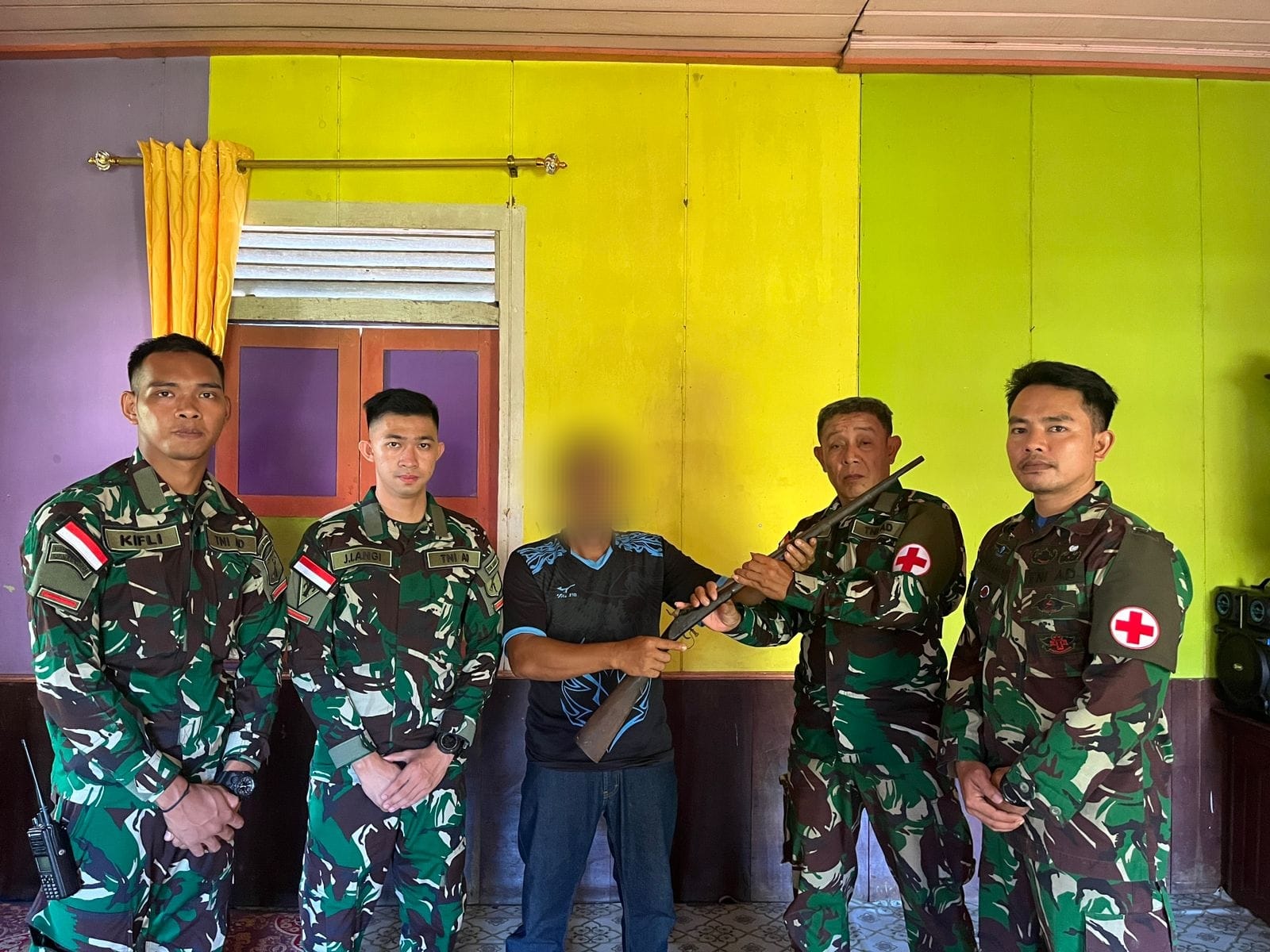 Satuan Tugas Pengamanan Perbatasan (Satgas Pamtas) RI-Malaysia Yonarmed 19/105 Trk Bogani menerima 3 pucuk senjata api rakitan laras panjang secara sukarela oleh masyarakat desa binaan.