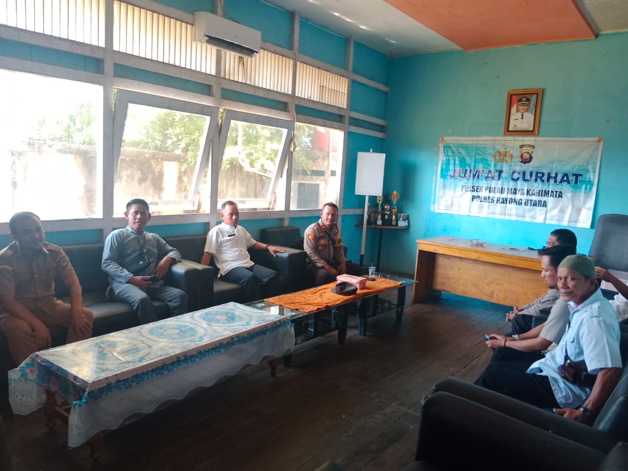 Pada hari ini, Jum’at tanggal 10 November 2023, sekira pukul 10.30 WIB di ruang pertemuan kantor Kec. Pulau Maya Kab. Kayong Utara telah dilaksanakan Kegiatan *JUM’AT CURHAT*, kegiatan yang dihadiri oleh Camat Pulau Maya Musdar, SE, Kapolsek PMK Ipda SR Sembiring, Kapus Tanjung Satai zulfiarahman, Staf kecamatan Hamran, Sekdes Tanjung Satai Toni Adani, Ps. Kanit Binmas Aipda Hamsyah, Kasi Pol PP Kec. Pulau Maya Ishak, Anggota PPS pak yan dan dalam pertemuan tersebut Kapolsek PMK IPDA SR SEMBIRING, menyampaikan beberapa Himbauan dan Pesan Kamtibmas, untuk