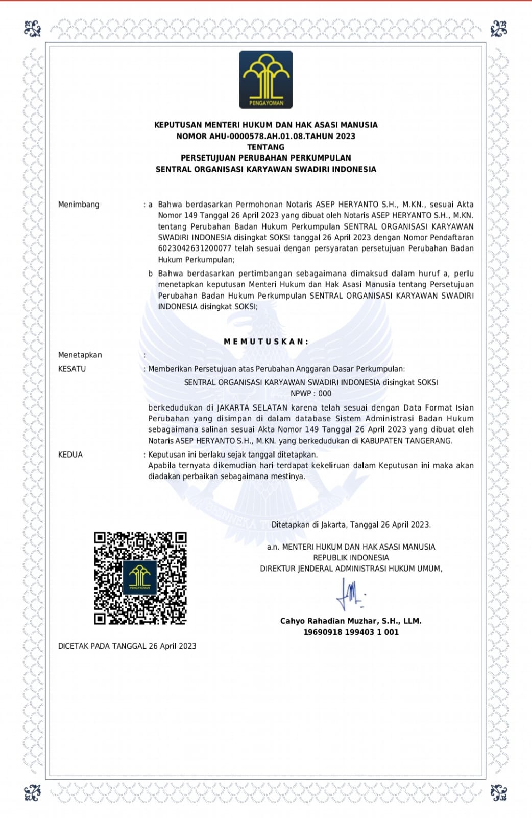 Ketua Umum Dewan Pimpinan Nasional Sentral Organisasi Karyawan Swadiri Indonesia (Depinas SOKSI), Ir. Ali Wongso Sinaga bersama Sekretaris Jenderal Dr. Ilyas Indra juga Para Wakil Ketua Umum, Para Ketua dan jajaran pengurus Depinas Soksi di Kantor Direktorat Jenderal Administrasi Hukum Umum (AHU) Kementrian Hukum dan Ham Republik Indonesia mengumumkan pengesahan perubahan Surat Keputusan dengan Nomer SK : AHU-0000578.AHA.01.08.Tahun 2023, Hukum Dan Ham Melalui Dirjen AHU Sentral Organisasi Karyawan Swadiri Indonesia atau disingkat Soksi Periode 2022 – 2027. Tentang persetujuan perkumpulan Sentral Organisasi Karyawan Swadiri Indonesia (SOKSI)