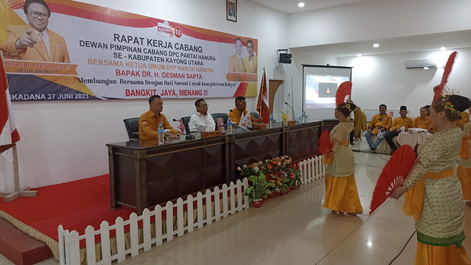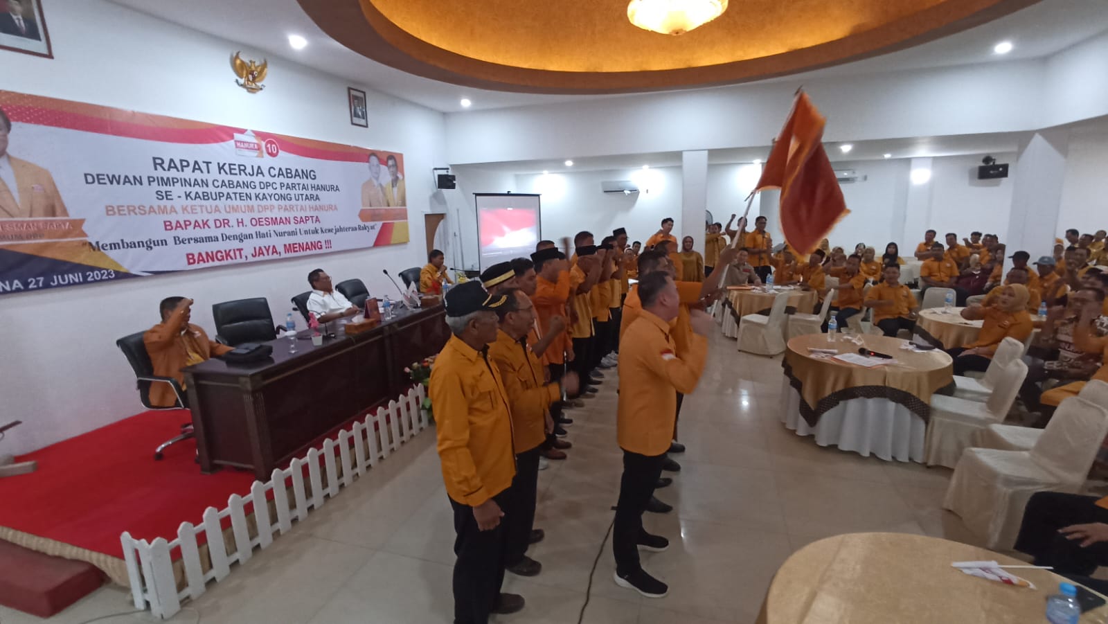 KABUPATEN KAYONG UTARA, KALBAR, PERISTIWAINDONESIA.COM | Ketua umum partai Hanura Oesman Sapta Odang sering disapa (Oso) menghadiri acara Rapat Kerja Cabang luar biasa (Rakercab), rapat kerja tersebut Berketepatan di hari ulang tahun berdirinya Kabupaten Kayong Utara, Propinsi Kalimantan barat. Selasa, (27/06/2023).