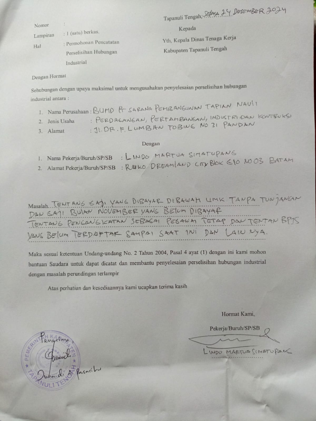 Sehingga pada tanggal 24 Desember 2024 Lindo Mertua Simatupang mendaftarkan permohonan pencatatan perselisihan hubungan industrial kepada dinas Tenaga kerja kabupaten tapanuli tengah,