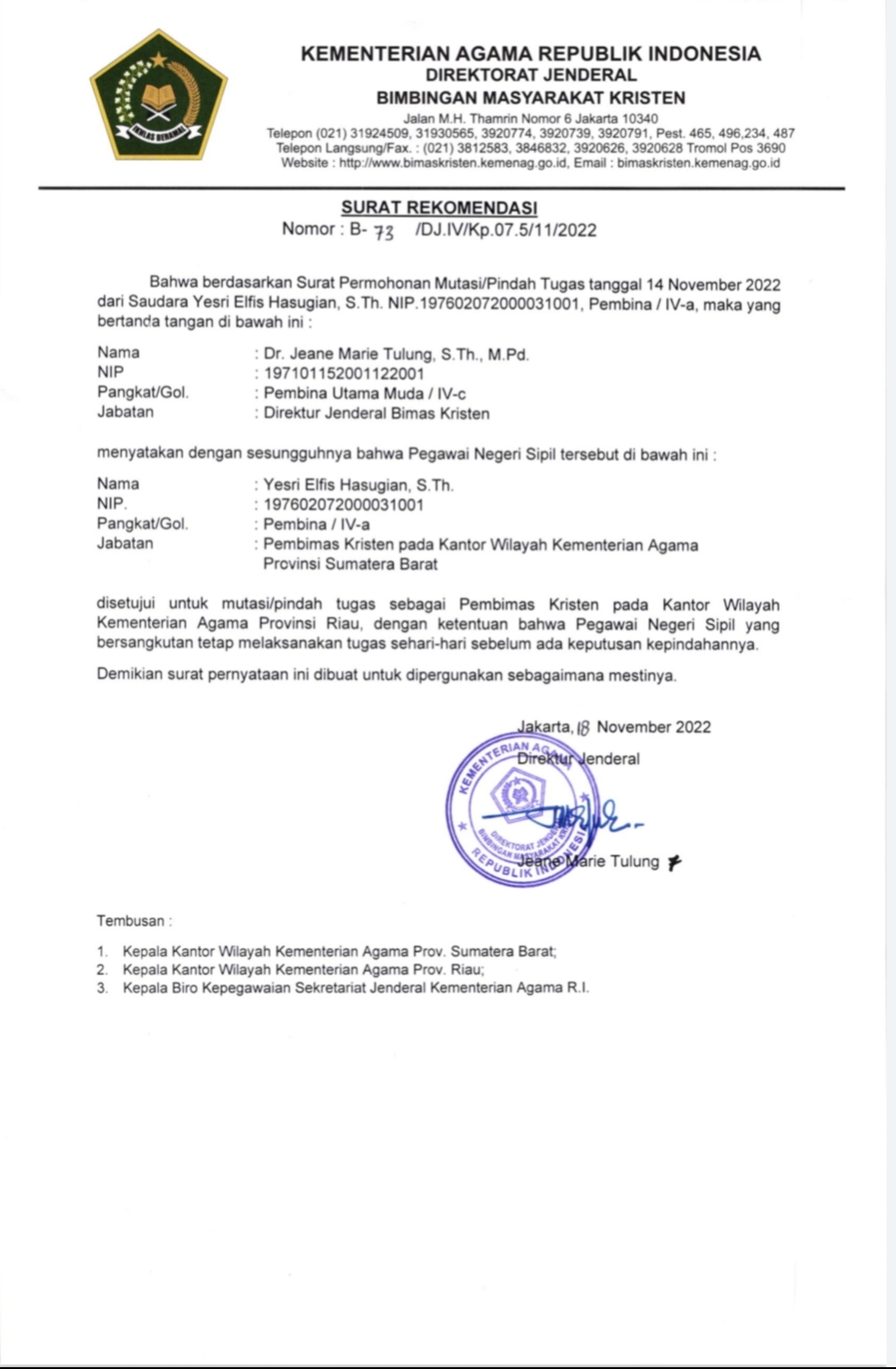 Pejabat yang melantik yaitu Kakanwil Riau dan Kabiro Kemenag RI telah mengabaikan surat Rekomendasi Dirjen Bimas Kristen tentang Mutasi dalam hal ini Kakanwil Riau dan Biro Kepegawaian Kemenag RI, diduga telah melanggar aturan selaku penerbit SK pejabat yang dilantik tersebut.