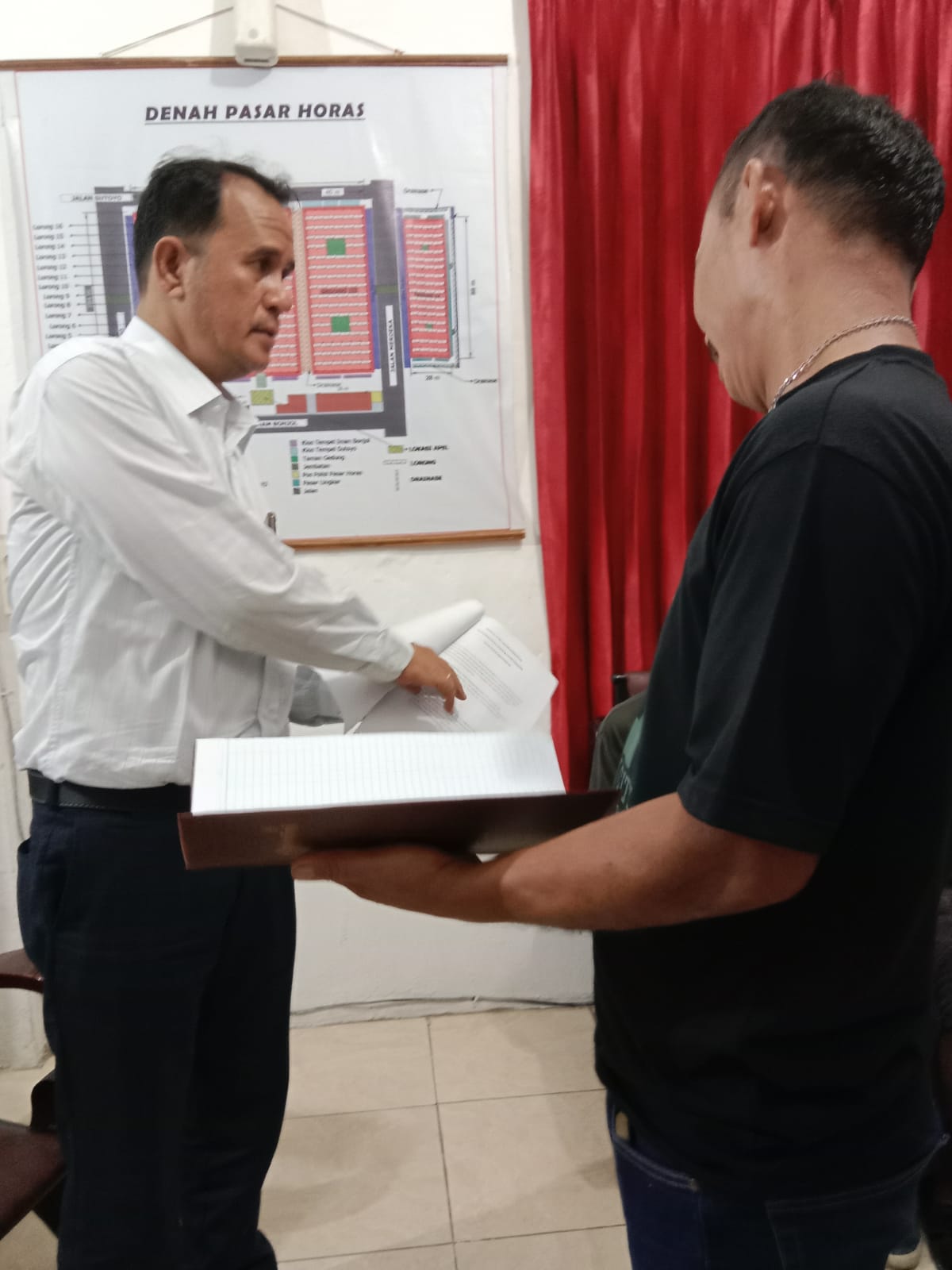 Beberapa perwakilan dari komunitas pedagang daging Pasar Horas dan Pasar Dwikora melakukan pertemuan dengan Dirut PD Pasar Horas Jaya (PD PHJ) Bolmen Silalahi, Rabu (26/7/2023) di ruang kerja Dirut PDPHJ di Gedung 2 Lt 3 Pusat Pasar Horas di jalan Imam Bonjol Kota Pematang Siantar.
