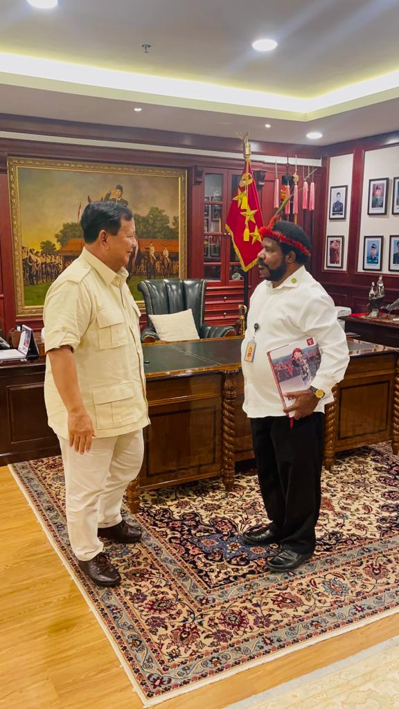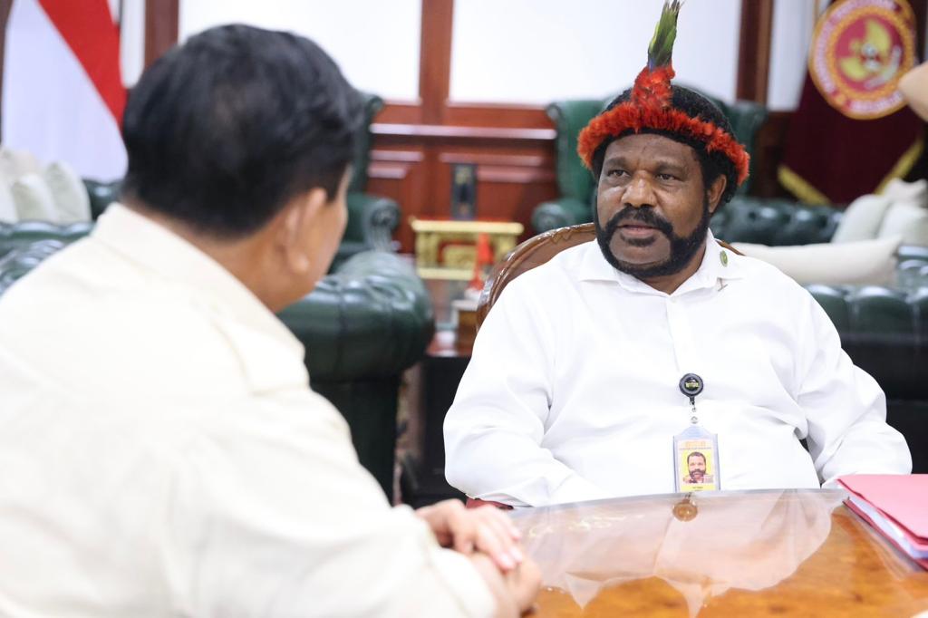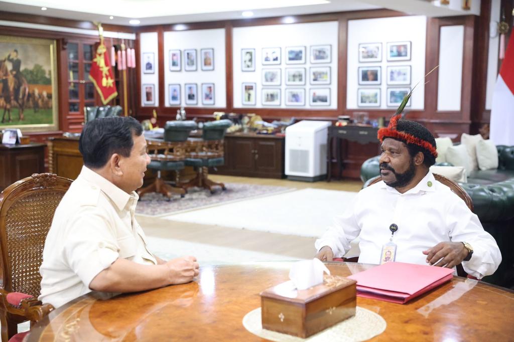 Menteri Pertahanan Prabowo Subianto menerima kunjungan Ketua Lembaga Masyarakat Adat Tanah Papua Lenis Kogoya di Kantor Kementerian Pertahanan (Kemhan) RI, Jakarta, Selasa.