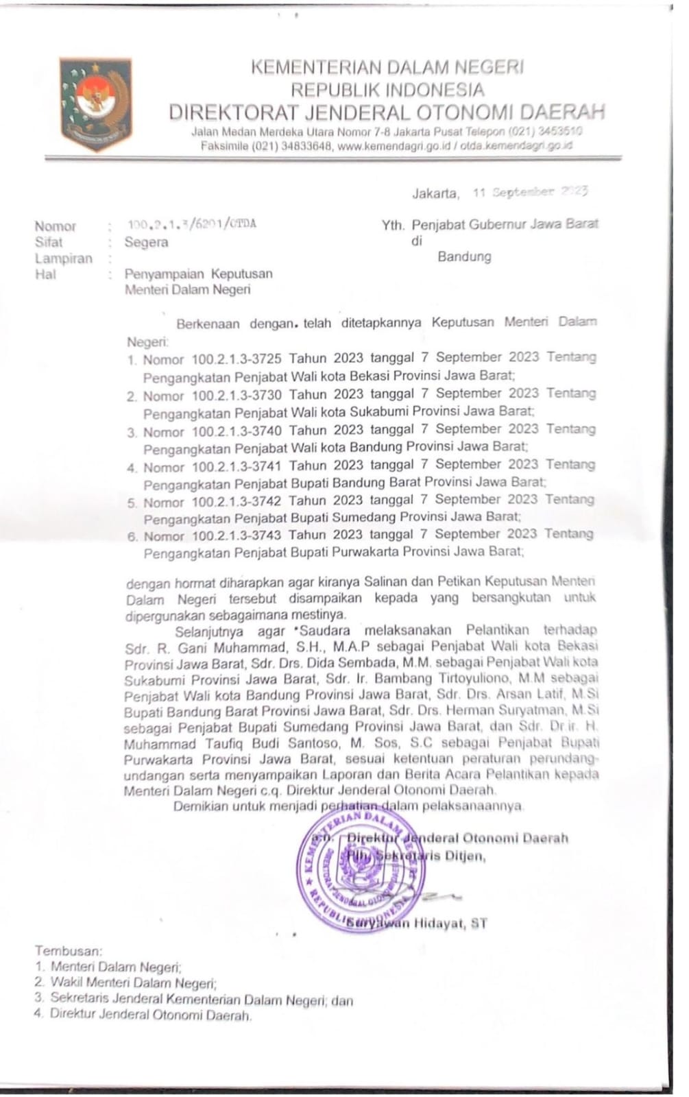 Surat Kementerian Dalam Negeri Direktorat Jenderal Otonomi Daerah Nomor : 100.2.1.3 /6201/OTDA tanggal 11 September 2023 kepada Gubernur Jawa Barat Perihal Penyampaian Surat Keputusan Menteri Dalam Negeri memuat Surat Keputusan Menteri Dalam Negeri No. 100.2.1.3-3725 Tahun 2023 tentang Pengangkatan R.Gani Muhammad,SH. MAP sebagai Walikota Kota Bekasi hingga terpilihnya Walikota Definitif pada Pemilu Tahun 2024 mendatang.