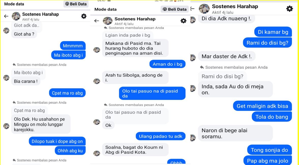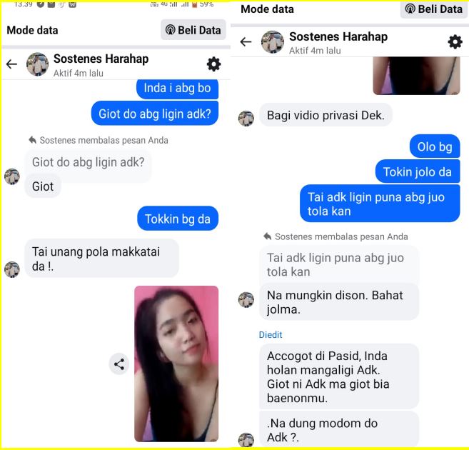 Percakapan menunjukkan permintaan vulgar seperti: “Adek lagi pakai daster ya, boleh kirimkan video privasinya dek” dalam bahasa Batak. Wanita tersebut dikabarkan memenuhi permintaan oknum.
