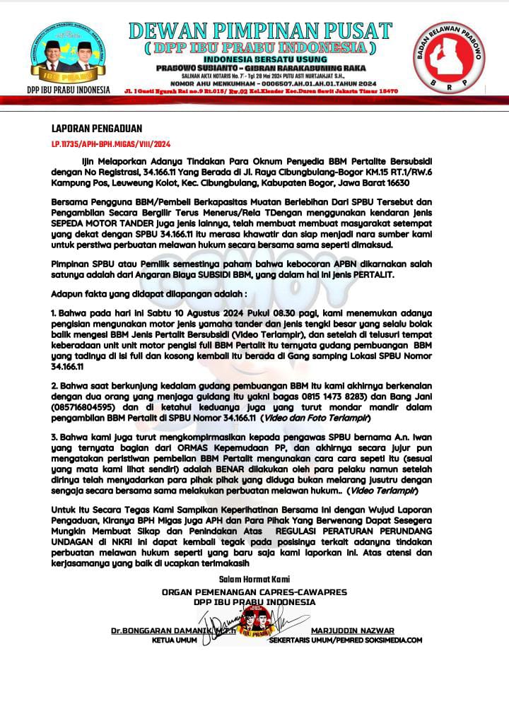 Dalam hal tersebut, Marjudin Nazwar selaku sekjend pemenangan Indonesia bersatu usung Prabowo Subianto Gibran (Ibu Prabu) langsung melakukan pengaduan melalui surat elektronik kepada BPH Migas,