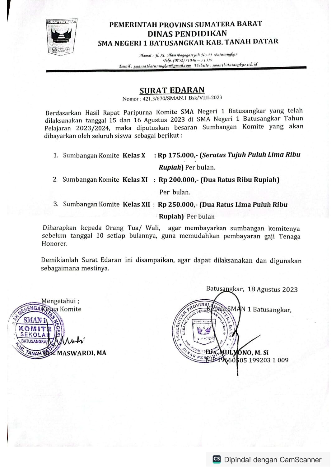 Beredarnya lembaran surat edaran perihal sumbangan komite di SMA 1 Batu Sangkar, Kabupaten Tanah Datar Sumbar, ditanggapi oleh LSM Garansi.