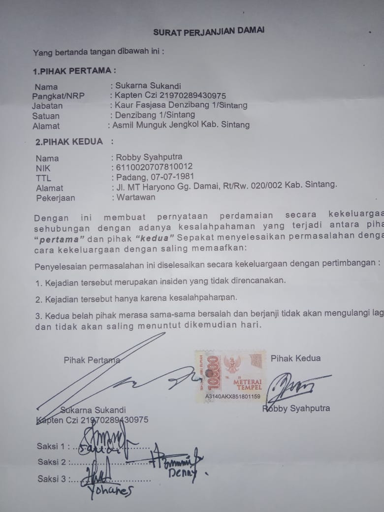 “Dengan surat ini membuat pernyataan perdamaian secara kekeluargaan sehubungan dengan adanya kesalah pahaman yang terjadi antara pihak “pertama” Dan”kedua “sepakat menyelesaikan permasalahan dengan cara kekeluargaan dengan saling memaafkan: