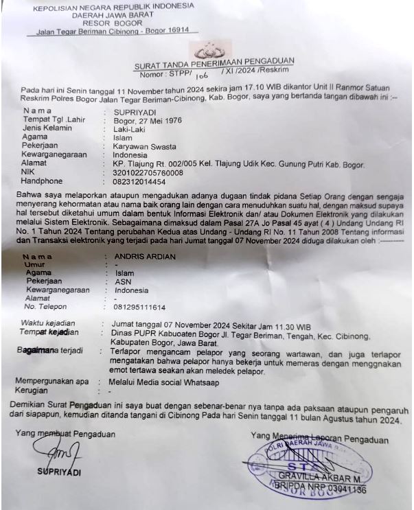 Sesuai Penerbitan Surat Tanda Terima Pengaduan Nomor : STPP/106/XI/2024/Reskrim, tertanggal 11 November 2024, yang memaparkan adanya kegiatan Reskrim Polres Kab.Bogor menerima pelaporan pengaduan masyarakat dan sekaligus serta merta menerbitkan surat tada terima laporan atasnama Pelapor Supriyadi, pemohon penegakan keadilan dan supremasi hukum dilakukan oleh seorang Oknum ASN dikantor desa kelpanunggal.