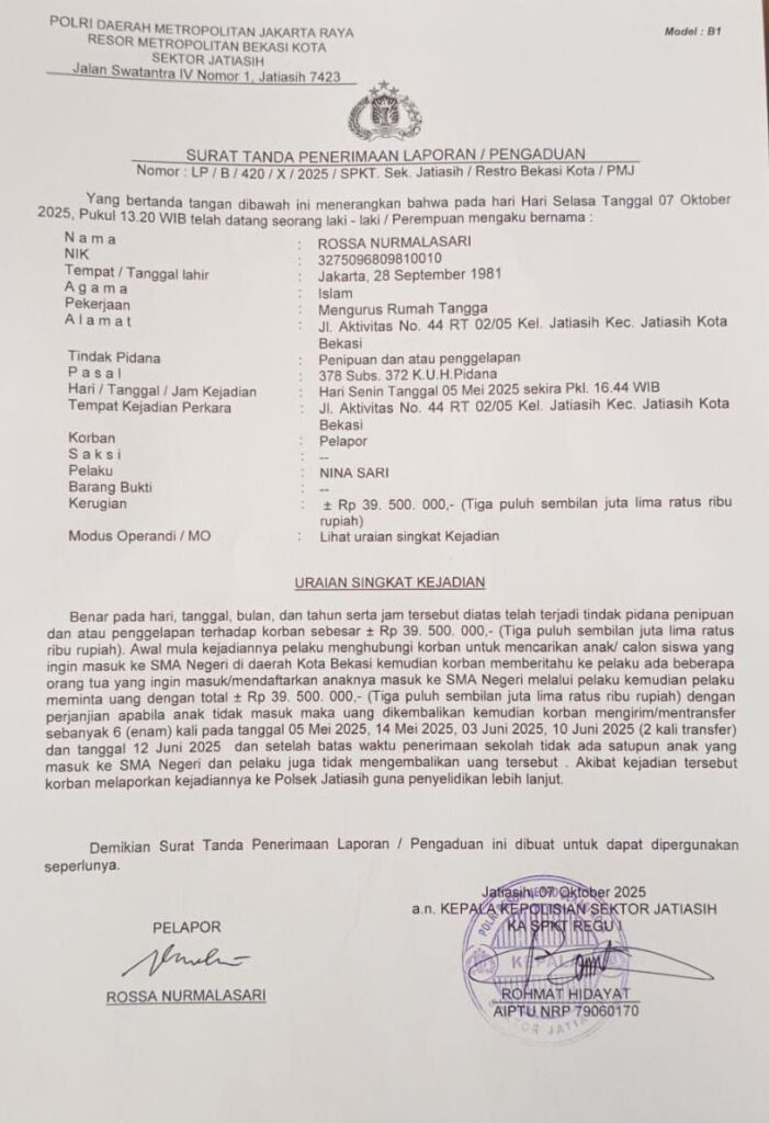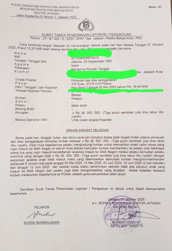 ‎Kasus penipuan dan penggelapan yang diduga dilakukan seorang pekerja Tata Usaha SMAN 6 berinisial (NS) dengan modus pemasukan calon murid diberbagai sekolah menengah (SMA) di kota Bekasi. Diketahui para walimurid yg menjadi korban dirugikan sejumlah uangnya memberikan kuasa kepada saudari Rosa Nurmalasari yang akhirnya membawa permasalahan perbuatan melawan hukum saudari (NS) ketingkat laporan pengaduan dengan nomor LP/B/420/X/2025/SPKT. Sek. Jatiasih. Restro Bekasi Kota / PMJ Selasa. 07-10-2025.